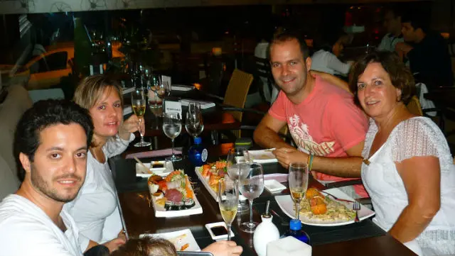 Éramos quatro pessoas e também pedimos tempurá, massa com funghi e hot roll de salmão, além de um combinado exótico, que incluía salmão, atum, peixe branco e enguias.