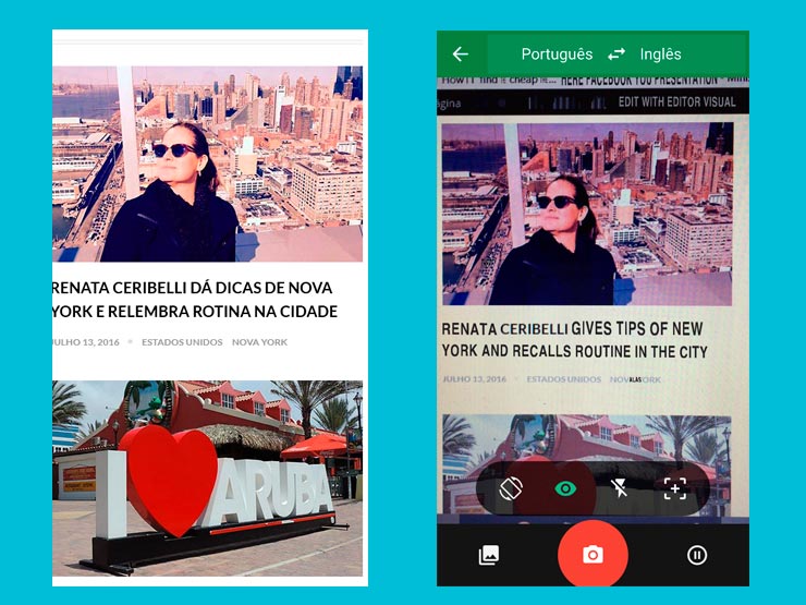 Outra funcionalidade do Google Tradutor é traduzir através da câmera fotográfica. Isso é ótimo quando estamos viajando para entender alguma placa ou até mesmo cardápios. É só ativar a câmera no aplicativo e colocar o celular em cima daquilo que você quer traduzir. A tradução irá aparecer na sua tela e também funciona offline.