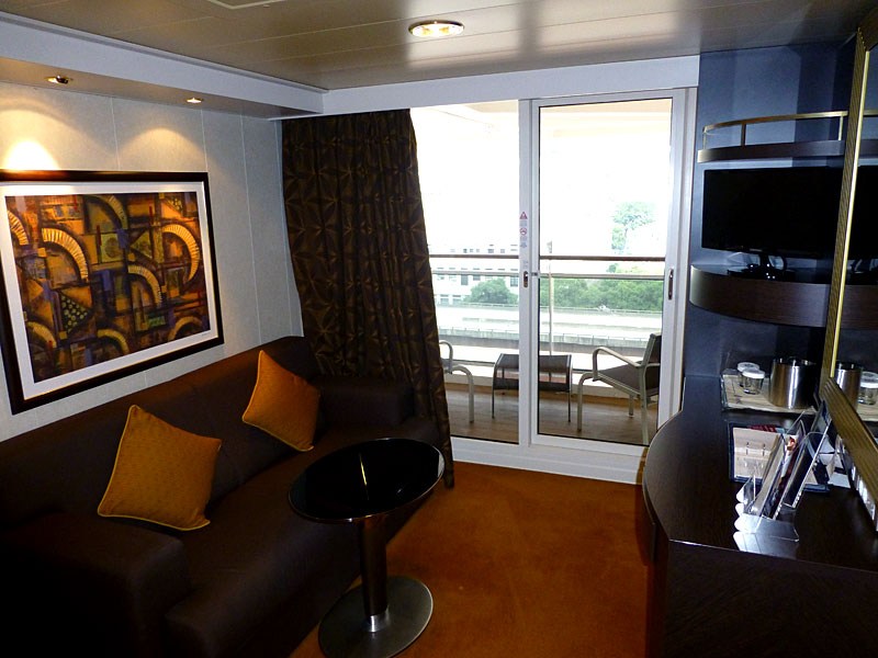 Das 1637 cabines, há 1200 externas com varanda. Foi em uma dessas que nós passamos a noite. Embarcamos no Rio de Janeiro por volta das 13h, e fomos para a nossa cabine antes de almoçar. A cabine com varanda era espaçosa. Com cama de casal bem confortável, uma TV de cerca de 24 polegadas com programação em espanhol e inglês (canais básicos como CNN e alguns de filmes), um sofá, espelhos e guarda-roupas. O banheiro também é bom. O chuveiro tem água quente e sai bastante água.