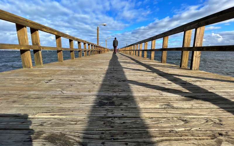 Homem observa a Playa Mansa em Punta del Este no inverno a partir de píer