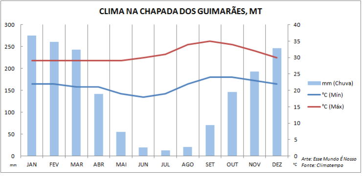 Os meses mais quentes são agosto, setembro e outubro. Nesta fase do ano, há mais possibilidade de queimadas.