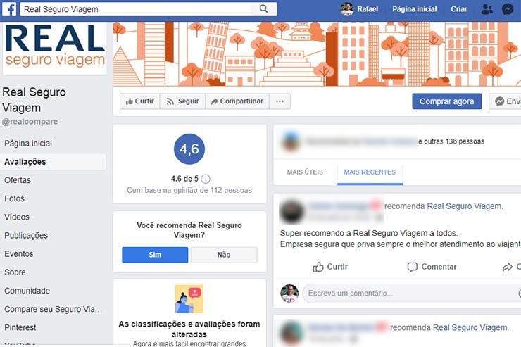 Entre as avaliações estão reclamações, elogios e questionamentos sobre seguros, que normalmente são respondidos pela Real Seguro Viagem.