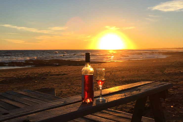 Depois, passamos em um supermercado, compramos vinho, queijo e repelente (tinha muito mosquito) e fomos curtir o pôr do sol na praia. Um dos mais lindos que já vimos!